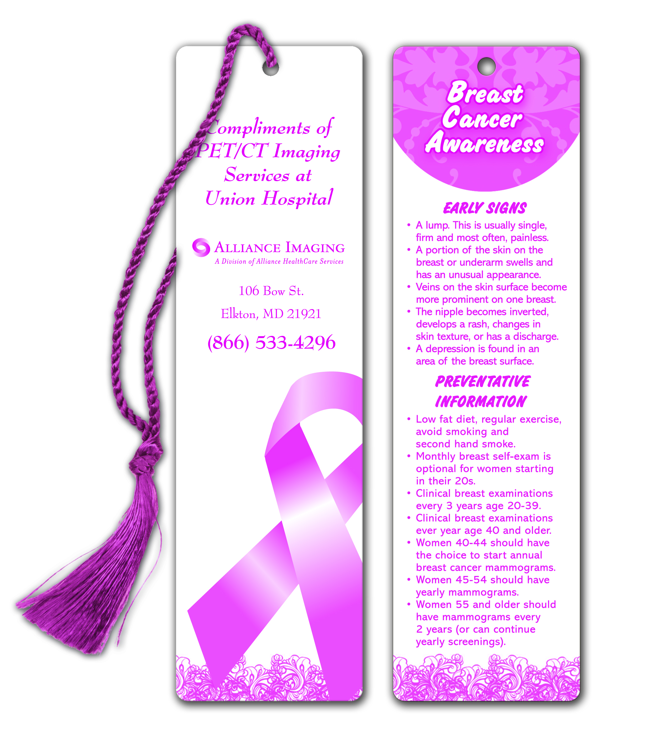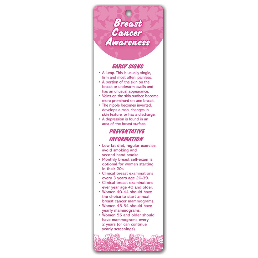 Discover the latest in Breast Cancer Prevention Information with this inspiring bookmark. Adorned with a pink tassel (optional purchase), it features a striking stock design on both sides.