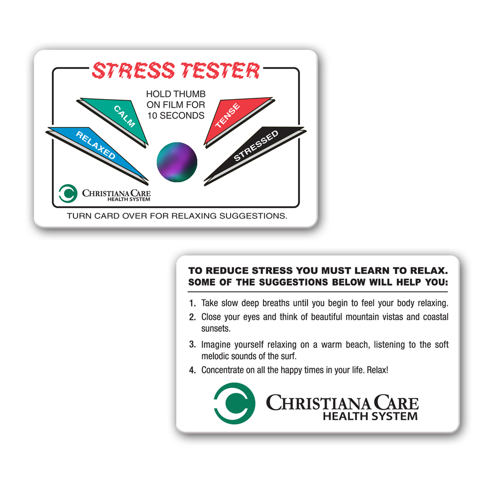 In the 1970s, mood rings featuring liquid crystals gained popularity by changing color in response to body temperature. Today, we proudly introduce the Stress Card, a fresh take on that concept. Perfect for events, festivals, and self-promotion, the Mood Card is fully customizable to enhance your occasion. Our pricing includes a vibrant stock 4-color front and a 1-color back, with options for custom designs on both sides, all featuring a stylish round crystal. Make your event stand out with the Stress Card!
