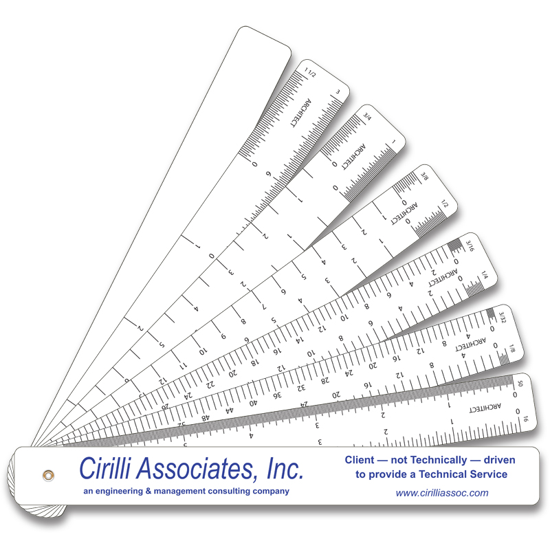 Engineering/Architect Ruler Booklet is eyeletted together. Terrific business card for contractors, architects, engineers, consultants, etc. Front and back page is for the client's information and the 6 inside rulers have stock architect scales on one side and engineering scales on the other side. This item is also available in 4 pages. Front and back cover with architect scales on the inside covers and on the front and back of the 2 remaining rulers. Same for engineering scales. Nice retail look. One color pricing is based on scales and imprint in the same color.
