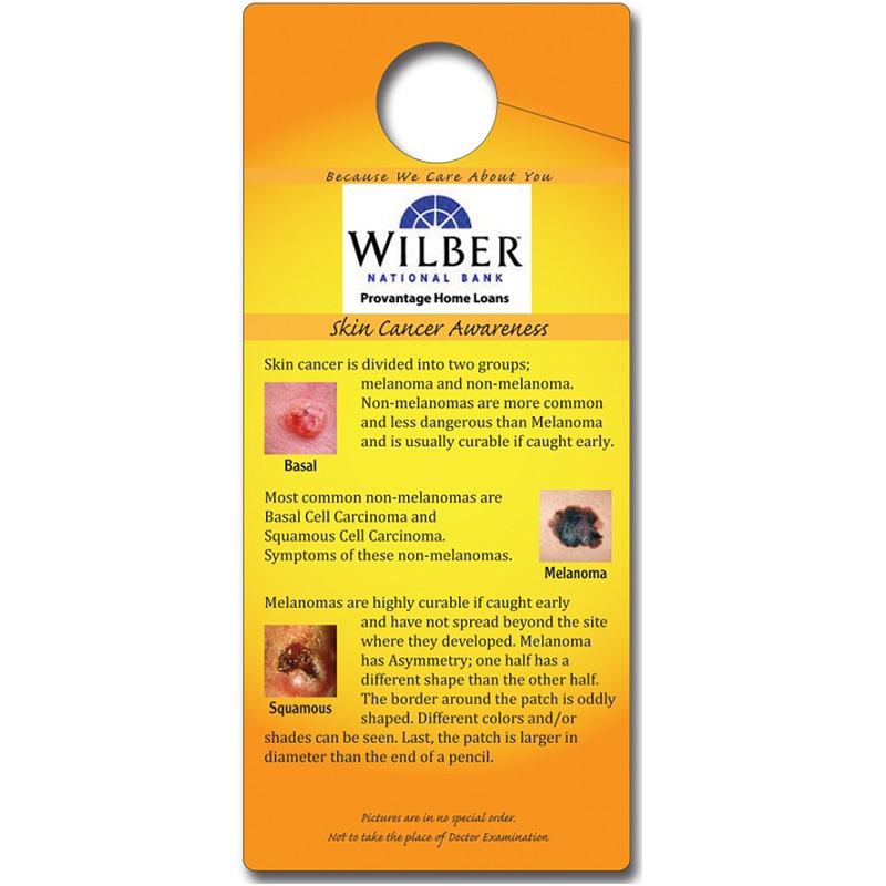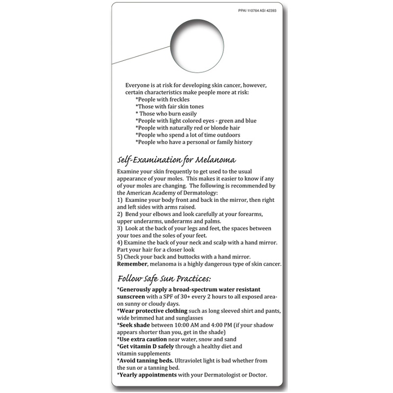 Stock, full color design and skin cancer types on the front along with ad copy. Back contains stock preventative information. Now available on .015
