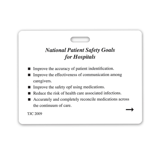 The plastic durable badge serves as a reminder of the national patient safety goals specifically designed for hospitals. It is intended to be worn underneath the hospital employee's ID badge, reinforcing their commitment to ensuring patient safety and quality care.