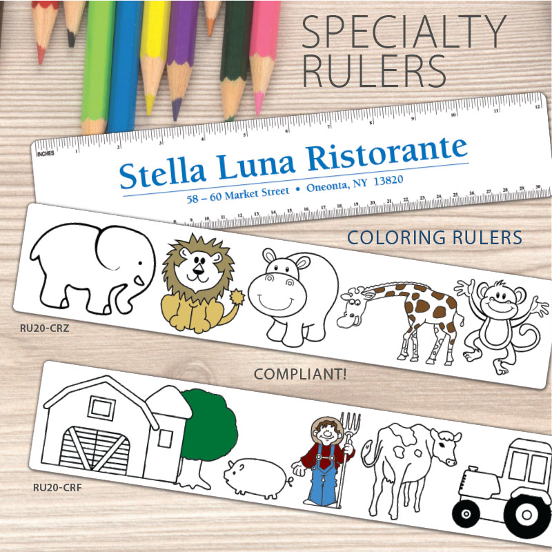 Here is a 12" coloring ruler featuring pictures you would see at a farm. There is no additional charge (if art is supplied) for custom pictures! Although we do not manufacture children's items, this ruler is one of two items created for children under 12 years old. It is compliant and will automatically be registered.