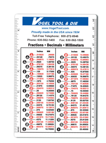 Mini Decimal Equivalent Chart. Standard art. For those clients who have their specific technical information, send in artwork and there is no additional charge. 1 color pricing includes a 1 color chart and the same 1 color imprint. For multi color chart, additional color(s) are necessary.