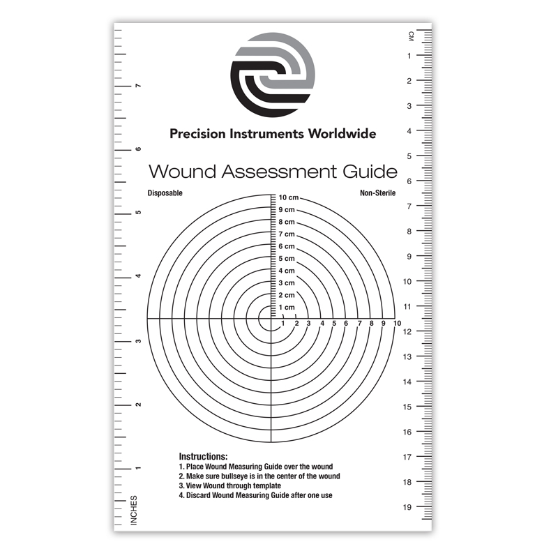 The Wound Assessment Guide is a single-use, clear, disposable sheet with a bullseye and grid ruler. It is an easy and effective measurement tool to determine the length, width, and diameter of wounds and incisions while eliminating cross-contamination. Each piece is slip sheeted for protection.